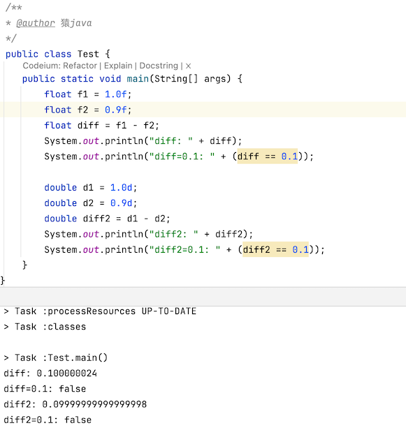 通过运行结果可以发现:在 Java中,不管是单精度 float,还是双精度 double,1.0 - 0.9 != 0.1,为什么?
