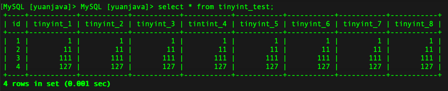 有个特殊的情况需要说明:在 java中,数据库的 tinyint(1)会自动转换为 java中的 boolean类型,tinyint(4)会正常转换为 int类型,所以实际开发中一般建议设置成 tinyint(4)。