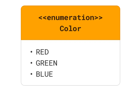 枚举是一种数据类型,用于定义一组命名值(例如,颜色、星期、月份等)。 在 UML 类图中,在枚举名称上方用关键字 «enumeration» 表示,枚举的值列在类框中。